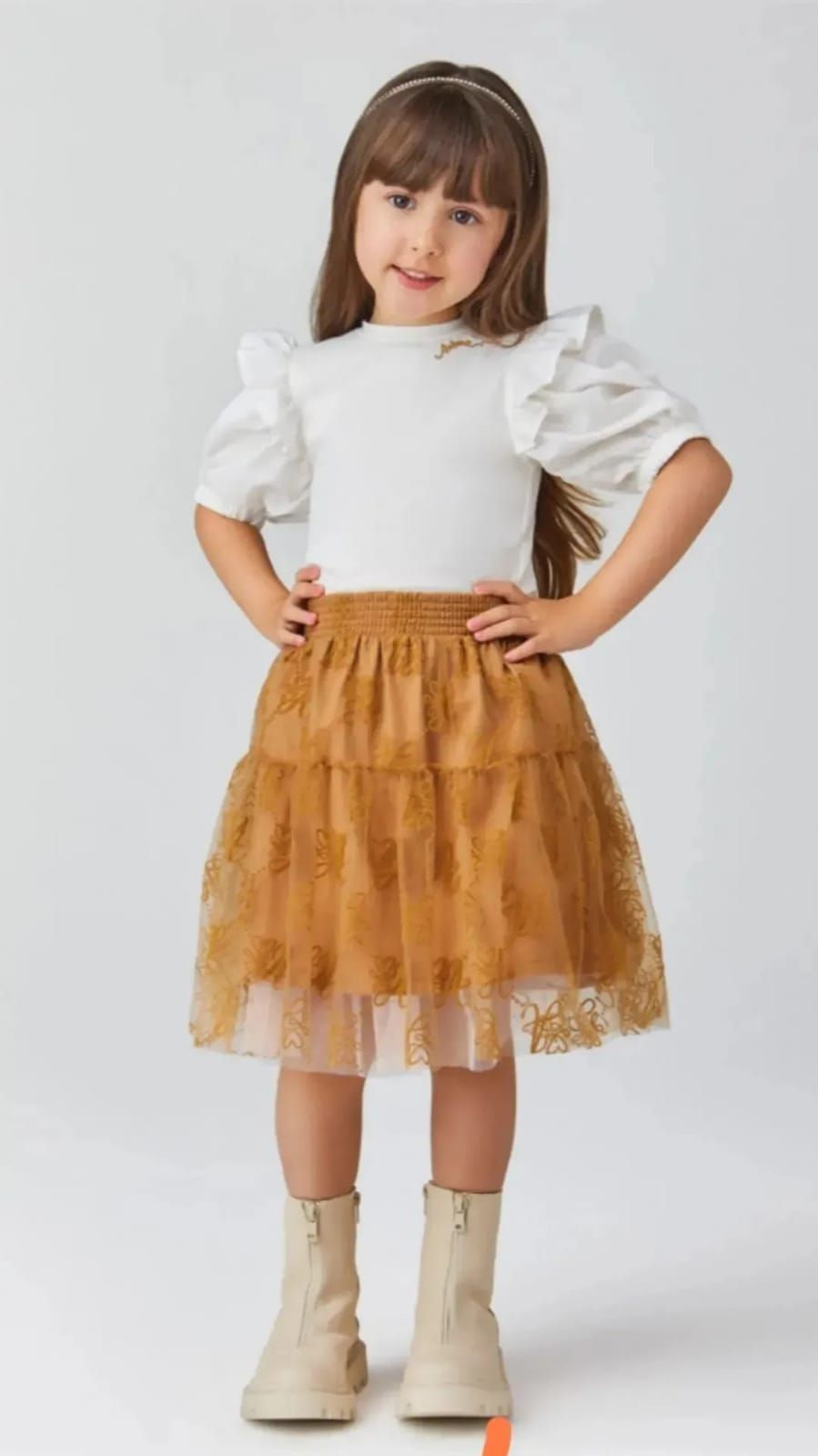 Conjunto com short saia e sobreposição no tule e blusa com mangas priincesas.