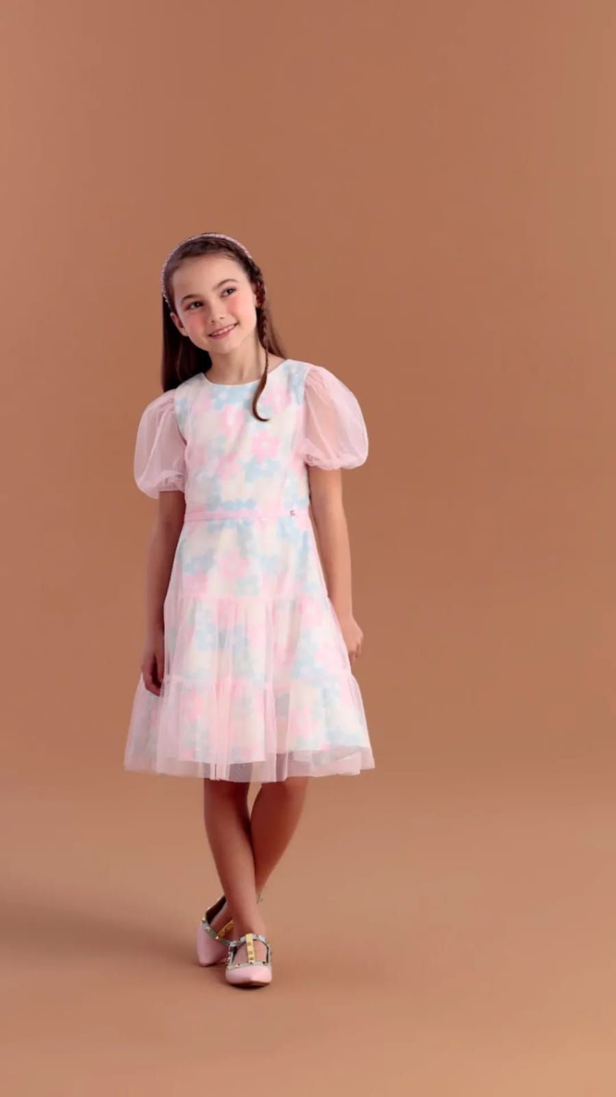 vestdo floral com cores pásteis e acabmento no tule.