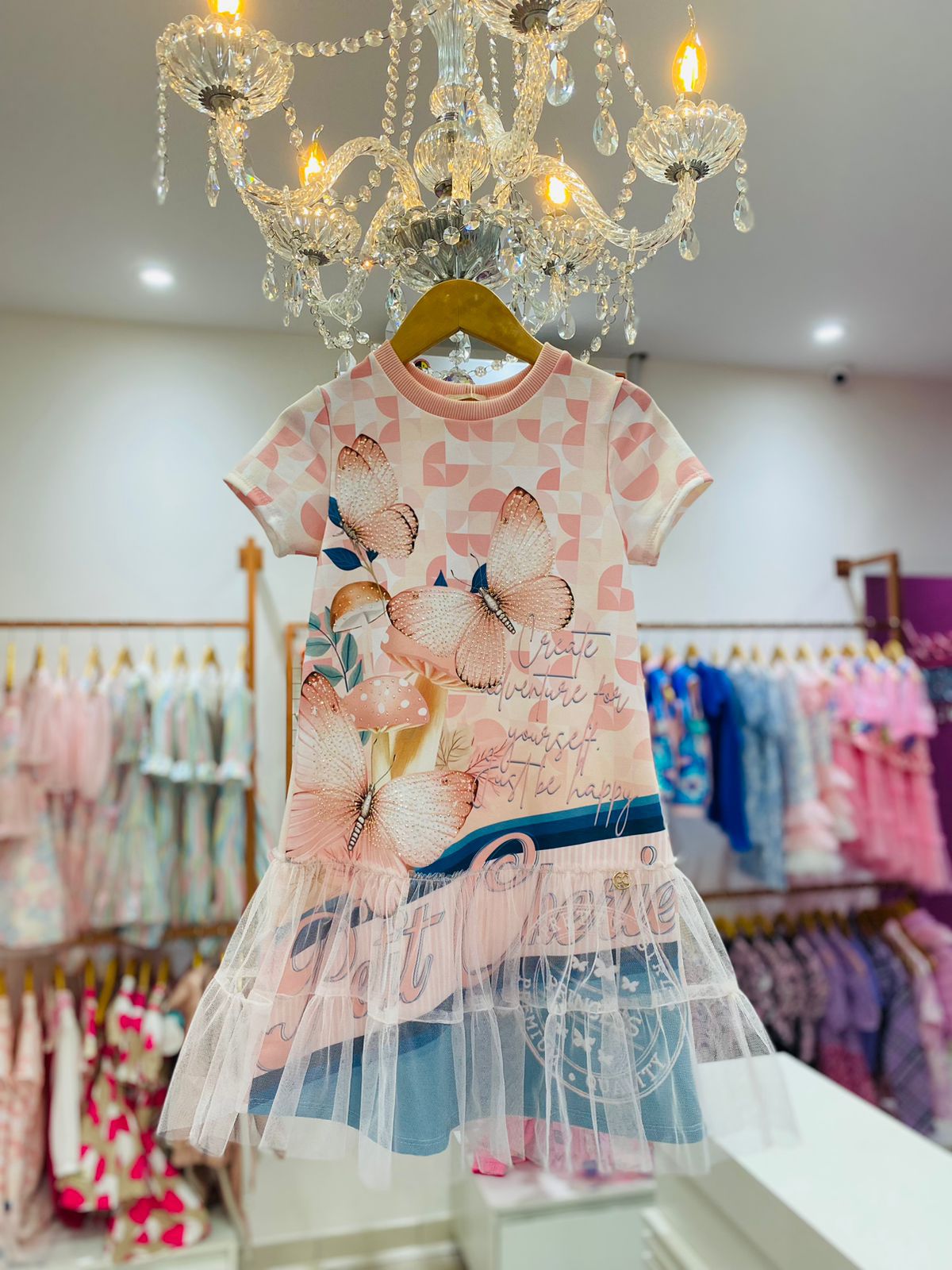 Vestido com acabamento no tule e aplicações na estampa, look versátil ideal para eventuaiis ocasiões e passeios.
